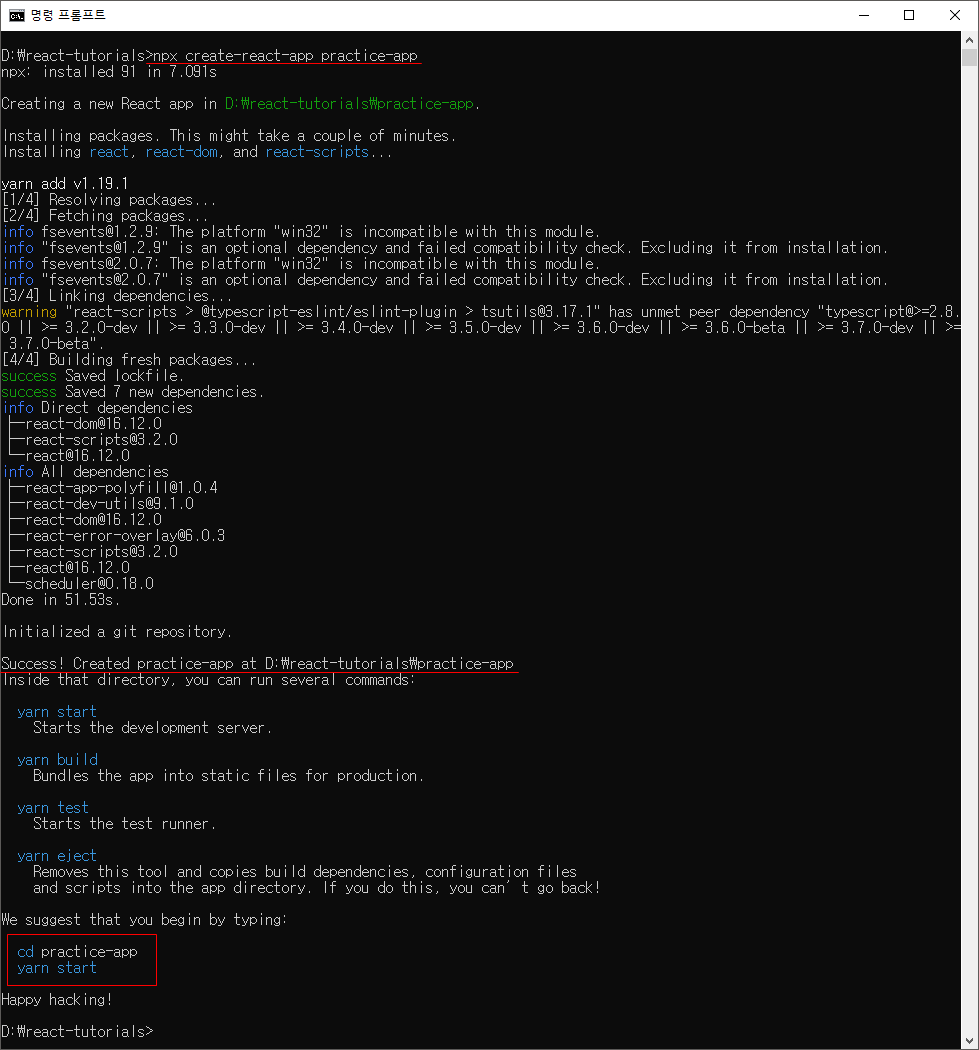 - 설치를 기다리다보면 "Success! Created practice-app at 작업폴더" 작업폴더에 프로젝트명으로 생성된 걸 메시지를 통해 확인할 수 있어요.