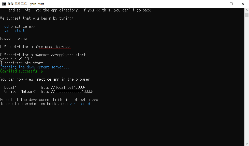 - 이로써 설치는 완료 되었고, 아래 네모칸에 있는것처럼 프로젝트로 이동해서 yarn start를 진행해볼께요.