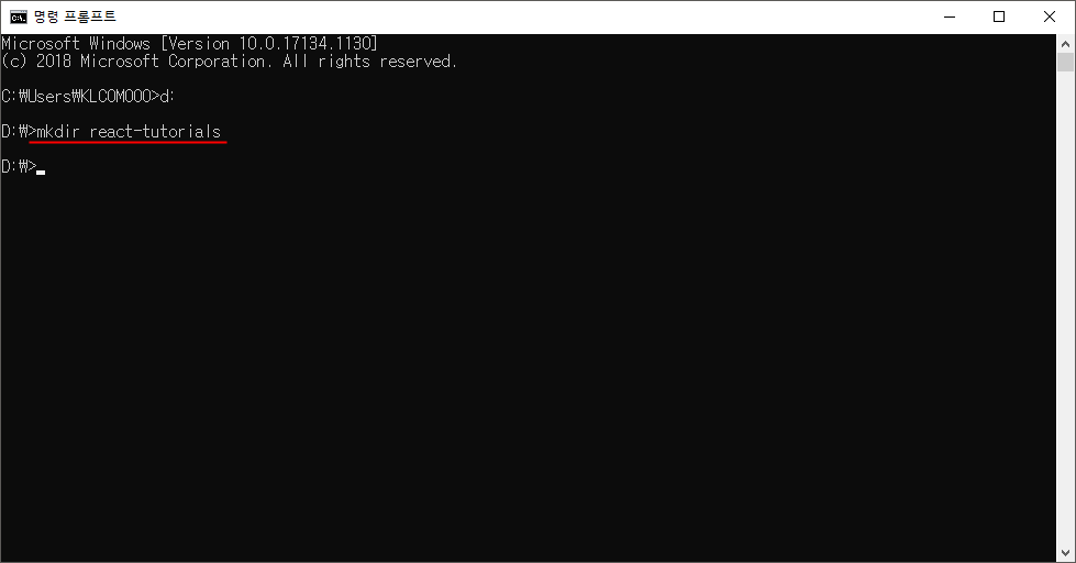 - cmd창을 띄워준 후 작업할 드라이브에 react-tutorials 폴더를 생성한다.